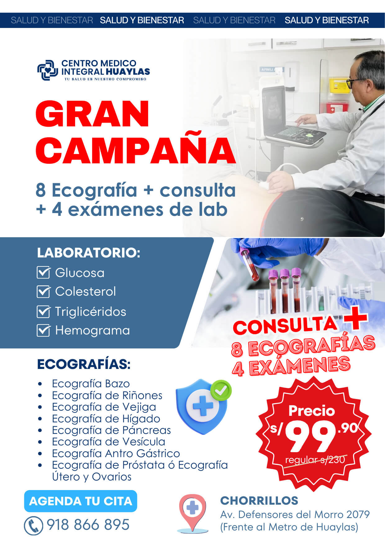 Ecografía: Bazo, Riñones, Vejiga, Hígado, Páncreas, Vesícula, Antro Gástrico, Próstata ó Ecografía de Útero y Ovarios. Laboratorio: Glucosa, Colesterol, Trigliceridos, Hemograma Completo